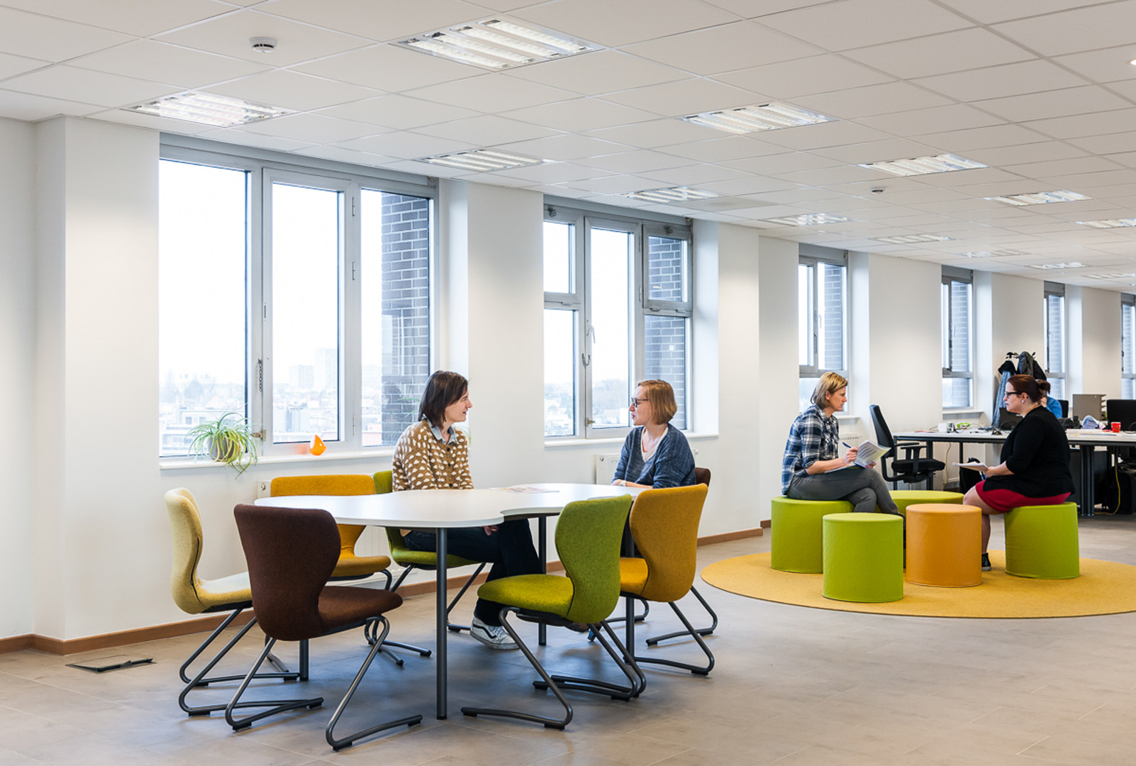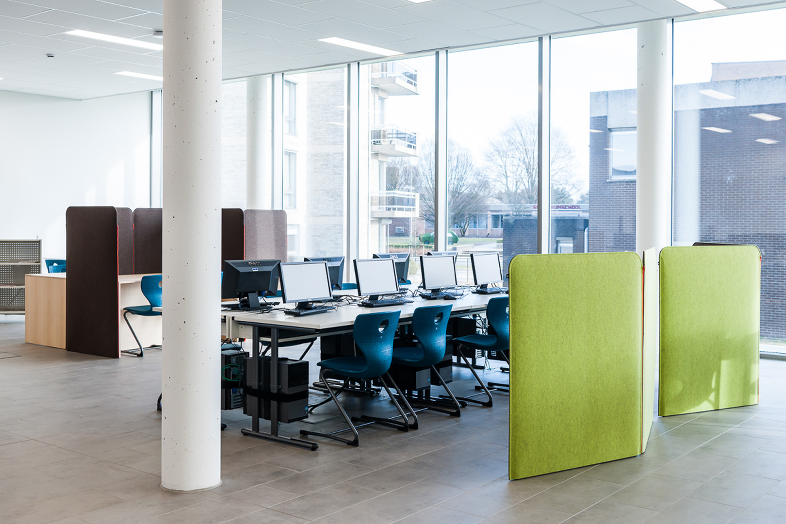 Het inzetten van vormentaal en flexibele opstellingen maken de betrokkenheid van alle gebruikers zeer groot. Men leeft samen op deze campus? Een mooi hedendaags en stijlvol kleurenpallet zet de toon.